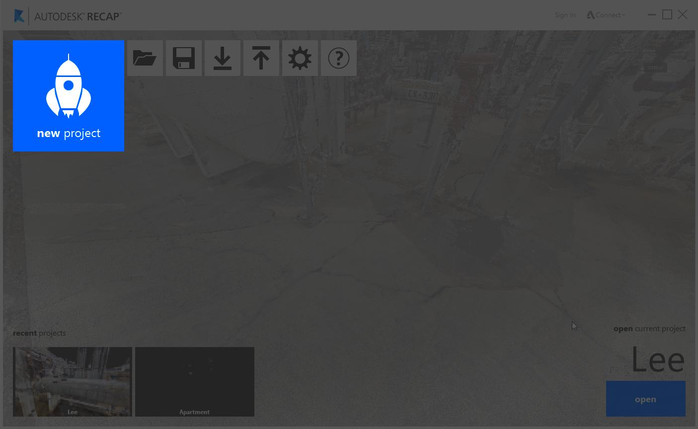 Project creation is split into several steps designed to help you get your scan data merged correctly into a point cloud. These are import, registration, and index. To start, hit the "New Project" button located on the home screen: