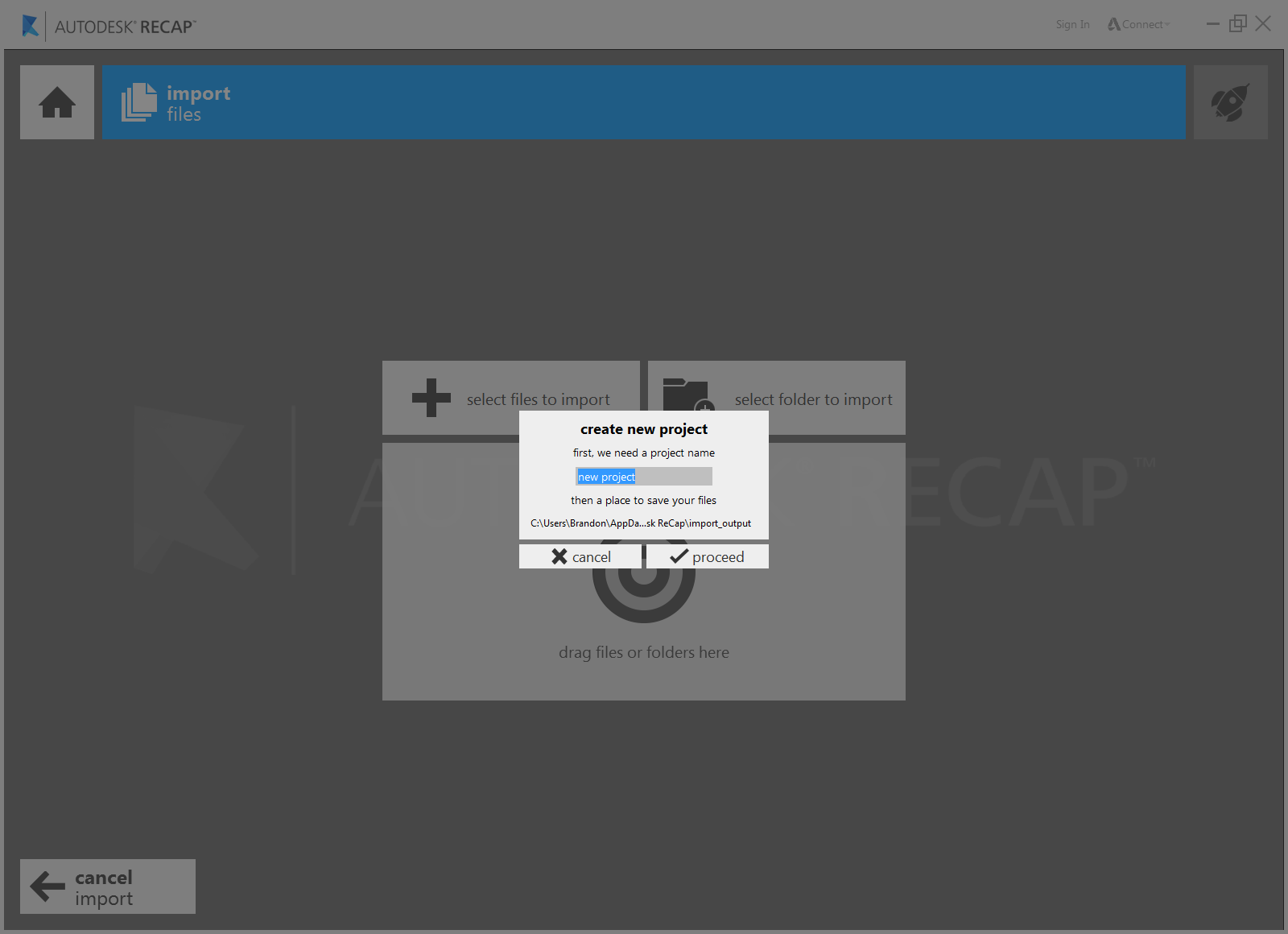 Just above the 'cancel' and 'proceed' buttons you will see the location your project will be saved. Click this text if you would like to save the project in a different location.