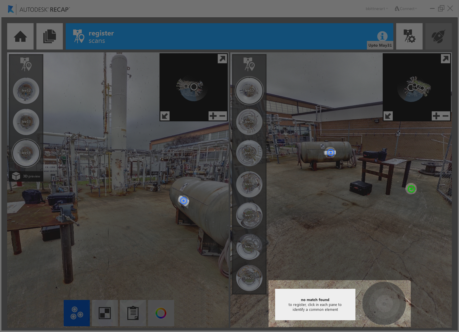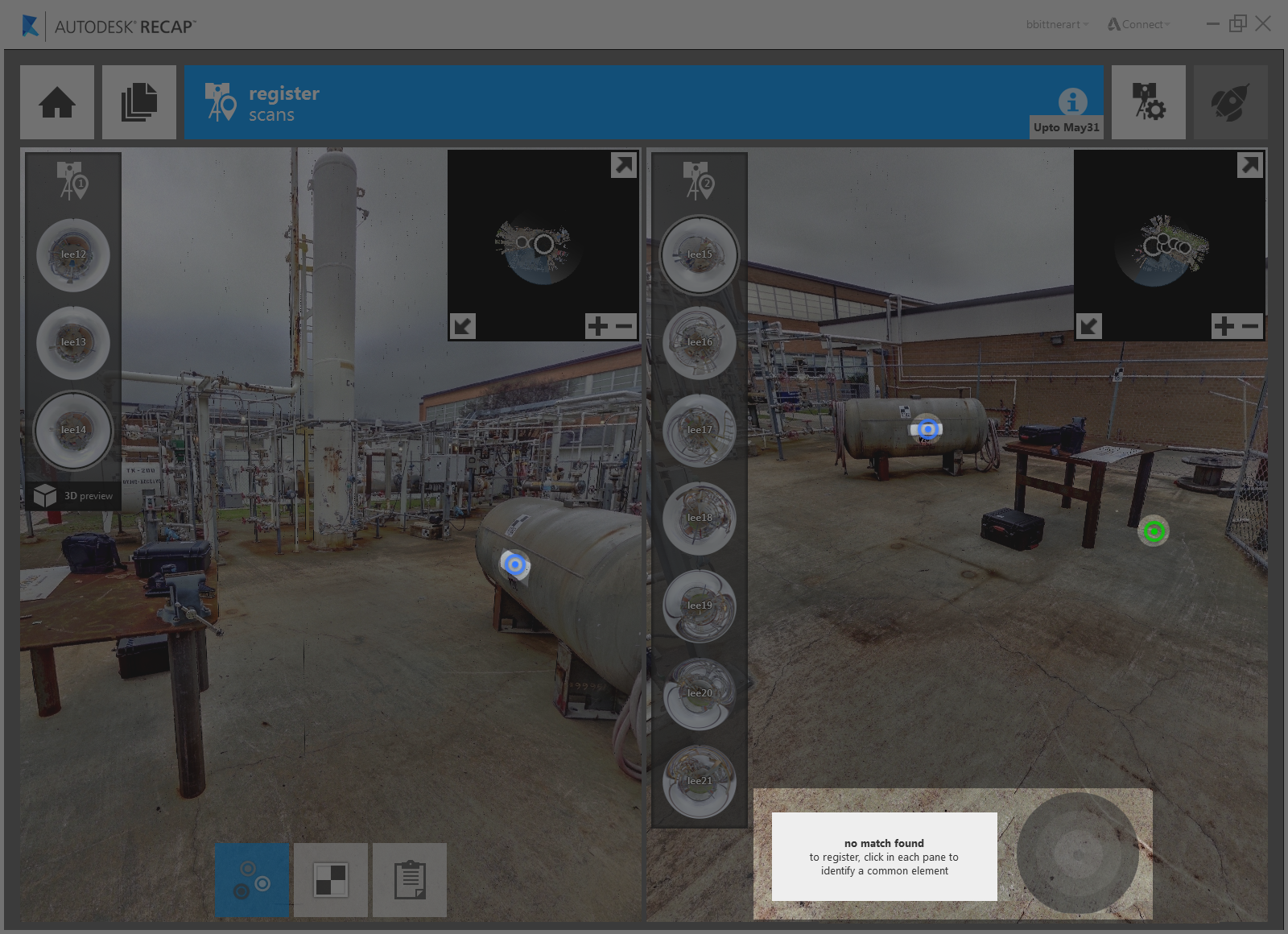 In some instances auto registration will not be able to find enough matching data to add a scan correctly. In these cases you will prompted to manually register the unregistered scans.
