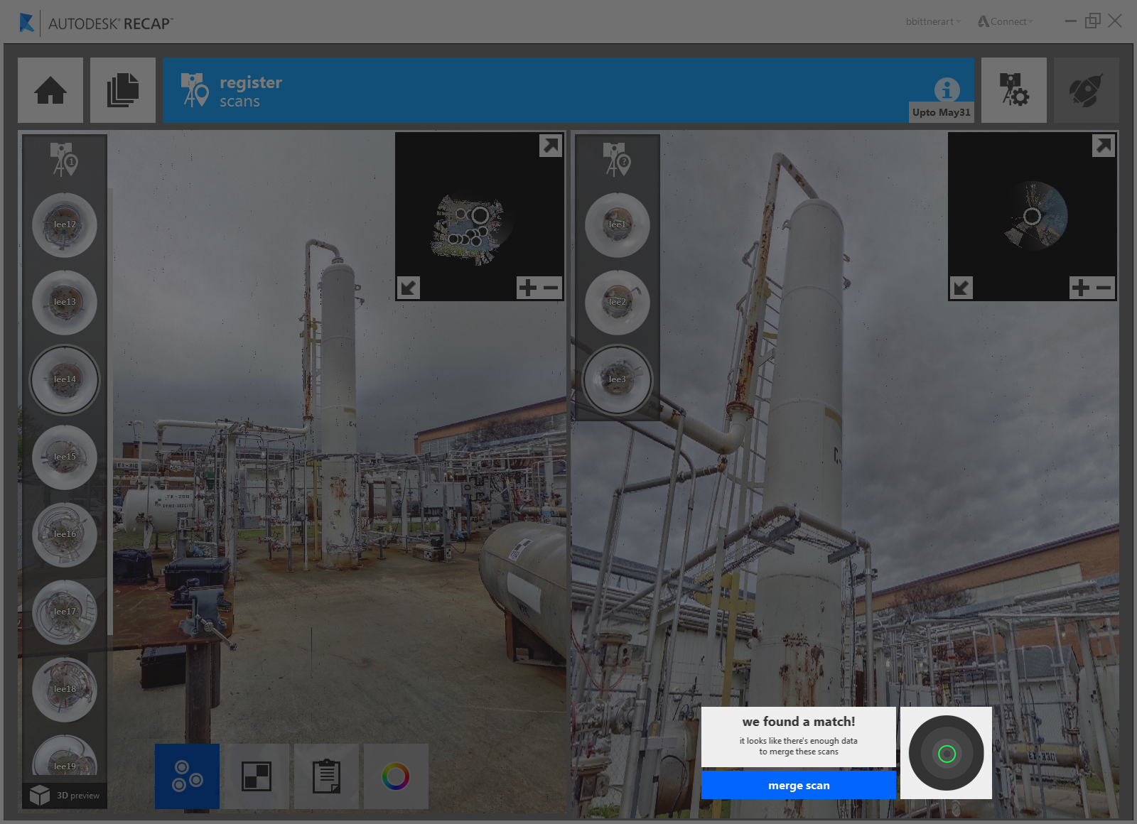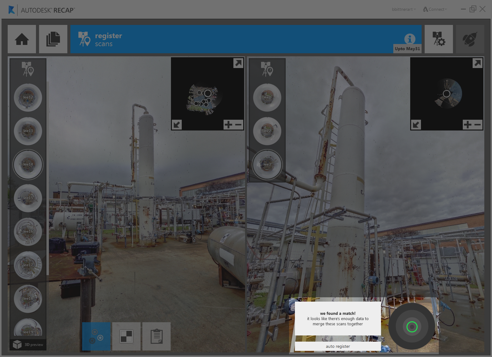 Auto registration is also active throughout the manual registration process. The active scan on the right is automatically checked for fit against the currently selected scan in the scan group on the left. In the case of a match or potential match you will be prompted to use the auto registration function.