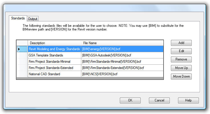 Within here you can add existing checks (*.bcf), edit the description (friendly name) and/or order displayed. When saved this is how it will be displayed in the predefined lists for the Check and Manage drop downs. This is saved in the Model Review.config file located in the installation folder, for use with multiple users this will need to be copied to the users installation folder to get the same configuration.