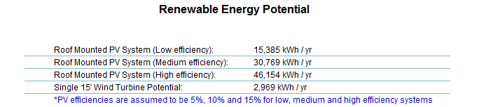 When reviewing an energy analysis in the Results and Compare dialog, this table summarizes the amount of electricity that the building site could produce using solar panels and wind turbines.