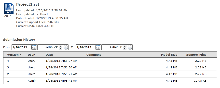 When you select a model in the tree control, the right pane displays a history of the edits that have been submitted, including any comments entered by team members, as shown below. Use the date filter to display items between specified dates.