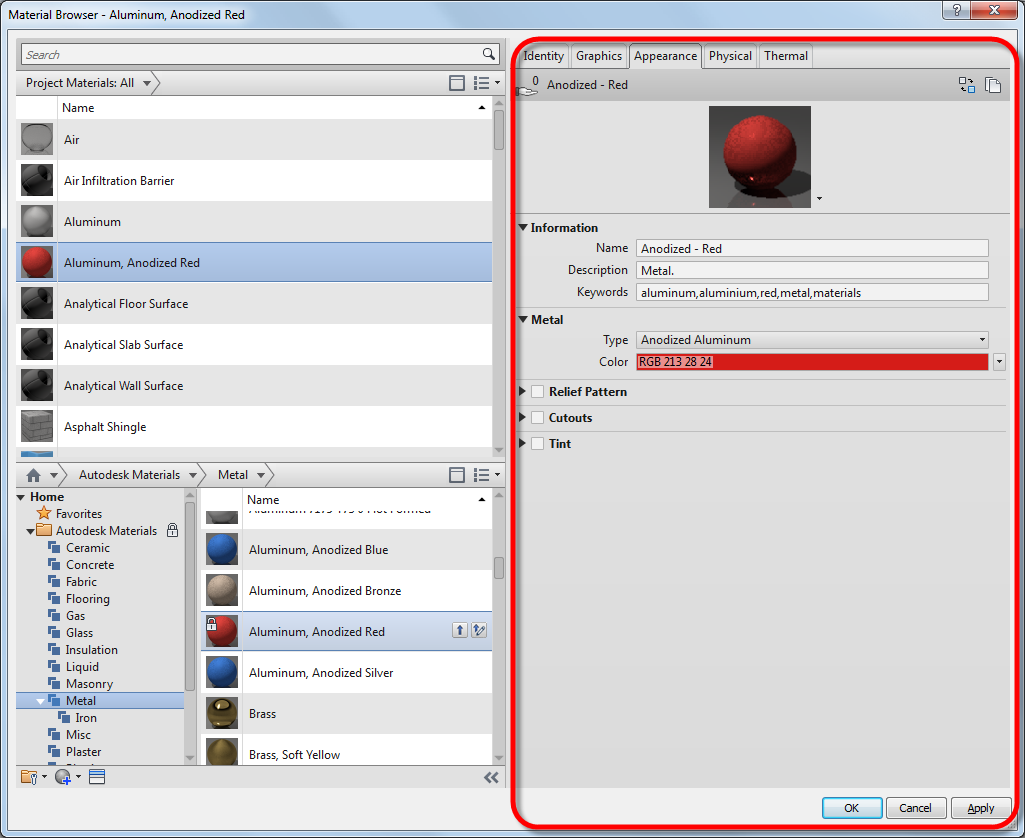 In the Material Browser, this information displays on the Identity, Graphics, and Appearance tabs of the Material Editor panel.