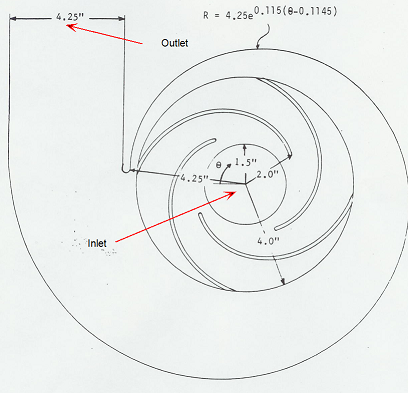 The impeller is a shrouded 4 bladed design with 16° log spiral blades. The inlet radius is 1.5 inches, the discharge radius is 4.0 inches and the leading edges of the blades are at a radius of 2.0 inches. The volute is a log spiral design. The volute angle of 83° was chosen to match the flow at the discharge of the impeller. The channel width of the impeller and volute regions is 0.97 inches.