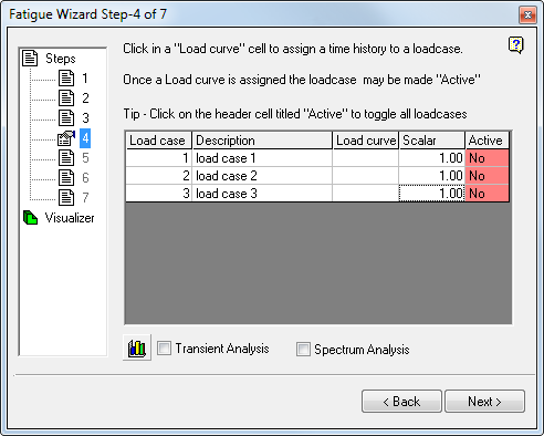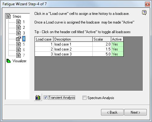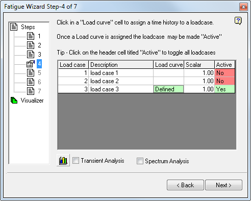 If necessary, after the load curve data is defined for a load case, you can remove it from the fatigue calculation by 'de-activating' the load case. Click the "Active" cell to toggle its status.