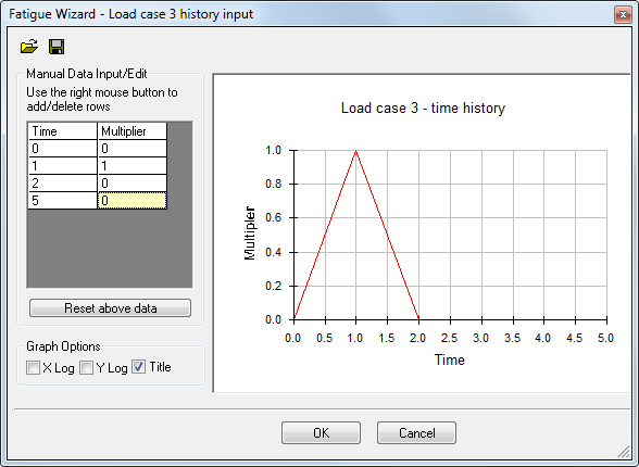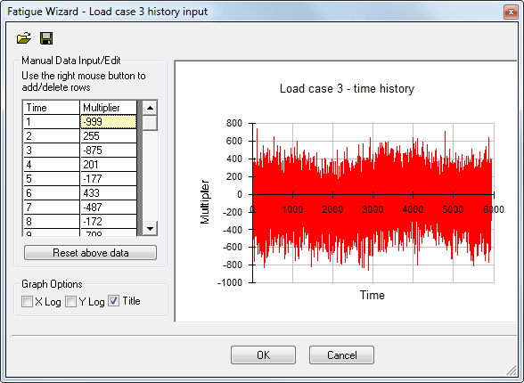 Follow the steps described previously for each of the load cases required in the fatigue analysis. Load histories applied to each load case do not have to have the same number of points, but must all start and finish at the same value of ‘time’. If not, Fatigue Wizard warns you.