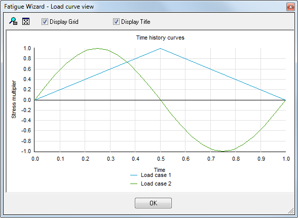 To define a cyclic event and a fatigue calculation, the analyst must assign a ‘load history’ to each of these load cases. The load history describes how the stresses calculated in the static FE model vary with time. In Fatigue Wizard, you can scale and combine any one or more of the load cases by a ‘load history’ to create the final cyclic stresses.