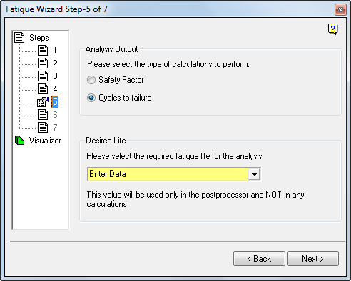 The layout of the Step 5 dialog box depends upon whether you elected to perform a fatigue life calculation or a fatigue safety factor calculation in Step 1. Fatigue Wizard tailors the form presented at Step 5 accordingly, and different input is required.