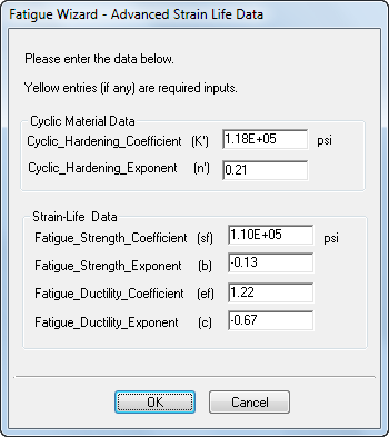 There are various methods for approximating strain-life material data from the more readily available monotonic data, such as tensile strength, elastic modulus, and so on. The method we use in Fatigue Wizard is the same one used by Seeger/Beste. It is present in many texts about strain based fatigue calculation. Basically this technique approximates the strain life curve (strain based coefficients) using the following formulae:
