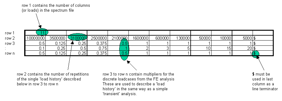 - Row 1 contains the total number of discrete loads that make up the spectrum file. In this case there are 11 discrete loads, so there are 11 columns in the spectrum file.