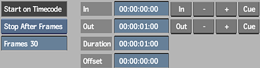 Besides the described methods of entering timecodes in the In, Out, and Dur fields, you can modify clip in and out points or cue the VTR to these points using the following controls on the right side of the Input or Output menu.