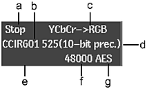 (a) VTR Status (b) VTR Timing (c) Colour Space (d) Bit Precision (e) Control Mode (f) Audio Sample Rate (g) Audio Input/Output Type
