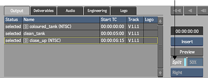 When you output a clip to a tape that already has media on it, you can enable a split view to compare a clip with a portion of tape, in much the same way as split view allows to compare two video segments in the player. This can be especially useful if you are outputting a clip to seamlessly overwrite a section on the tape.