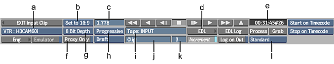 (a) Device Name box (b) Aspect Ratio box (c) Aspect Ratio field (d) EDL button (e) Current Timecode field (f) Proxy Quality box (g) Bit Depth box (h) Scan mode box (i) Tape Name field (j) Clip Name field (k) Increment Name field (l) Tape Type box