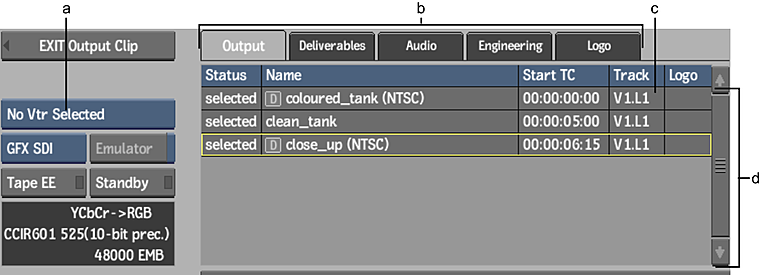 - Displays information about the clip selected for output. If there are multiple clips, you can sort them by clicking the column headings. This changes the output sequence order. You can also edit the Timecode field in this list.