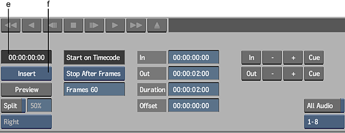 - Indicates the offset, in timecode, by which the selected clip is output. For example, an offset of 00:00:00:05 indicates that the first five frames of the clip to be output are skipped. The first frame to be output is frame 5 of the clip (counting frames from 0).