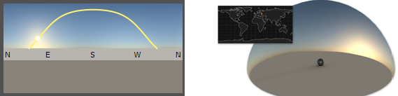 A skylight environment provides physical correct simulated lighting depending on world time and location. Skylights are procedurally generated Sphere Environment materials.