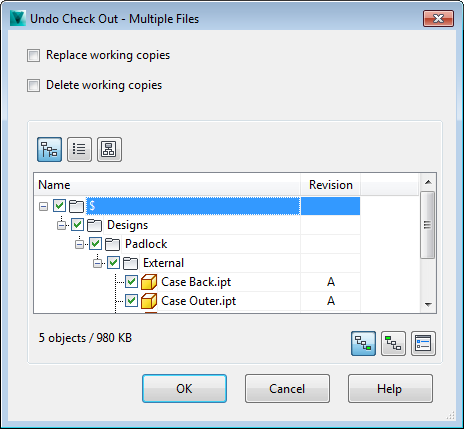 - In the Undo Check Out dialog box, specify if you want to replace the local file with the version currently stored in the vault and whether or not to delete the working copy of the file. Select Replace working copies to reset any changes that were made to the working copy of the file.