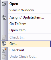 Use the Get command to download a read-only copy of a file from the vault and to check out specific versions or revisions of files for editing.