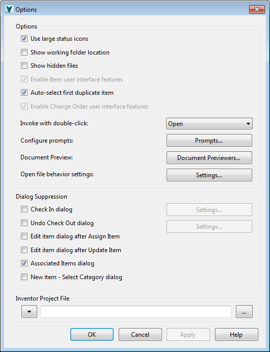 The Options dialog box in the Vault stand-alone client allows you to customize as well as streamline your workflow by suppressing certain dialog boxes and prompts.