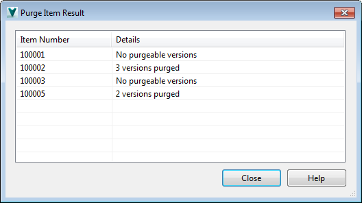 After you Purge Items with the Vault Client, the Purge Item Result dialog displays. This dialog shows the item numbers for all items that were selected for purge, and the number of versions of each item that were successfully purged.