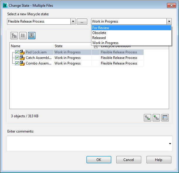 The Change State command allows users to modify the lifecycle state for files, folders, items, and custom objects. Changing the lifecycle state of a Vault object enforces certain lifecycle behaviors configured by the Vault administrator to occur. Examples of states include Work in Progress, Released, and Obsolete.