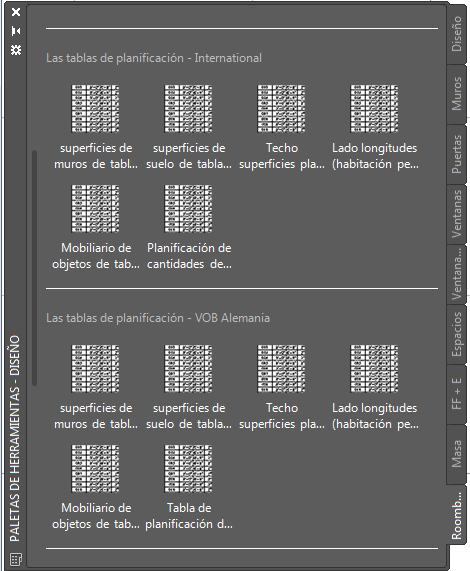 La paleta de herramientas Roombook contiene las distintas tablas de planificación según la norma de cálculo actual. Los comandos están vinculados al archivo