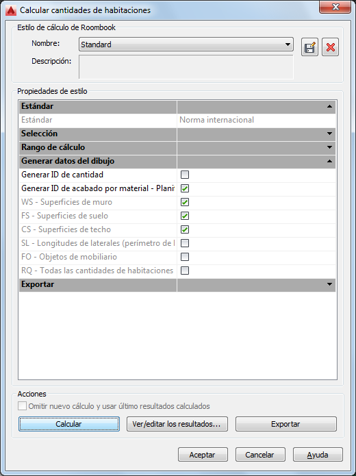 - En el cuadro de diálogo Calcular cantidades de habitaciones, en Propiedades de estilo, lista Generar datos del dibujo, seleccione Generar ID de acabado por material.