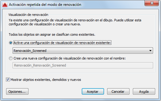 Al volver a activar el modo de renovación en un dibujo activado previamente, puede seguir utilizando la configuración de visualización de renovación existente o crear una nueva.