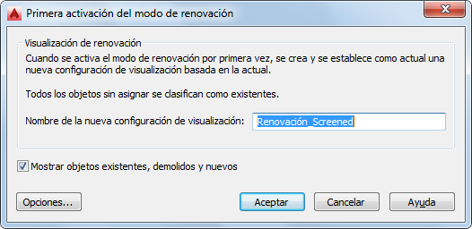 Se abrirá el cuadro de diálogo Primera activación del modo de renovación y, de modo predeterminado, se asignará un nombre a la nueva configuración de visualización con el prefijo Renovation.