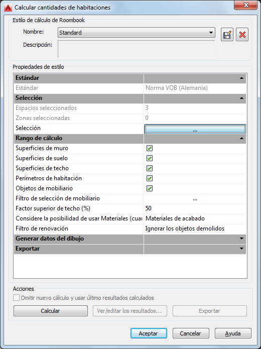 - Si se añaden nuevos espacios o zonas a un dibujo después de haber realizado un cálculo de cantidad de habitaciones, esta opción especifica que los nuevos espacios y zonas se incluyan automáticamente en el próximo cálculo. Por defecto, la opción está activada.