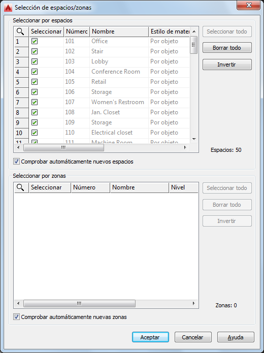 - En este cuadro de diálogo, solo se pueden seleccionar los espacios y las zonas para calcular activando la marca de verificación.