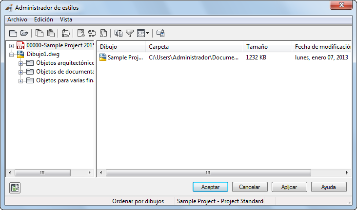 Utilice este procedimiento para cambiar la forma de ordenar los estilos en el Administrador de estilos. De forma predeterminada, los nombres de las plantillas y los dibujos abiertos se muestran en la vista en árbol en el panel de la izquierda. Al ampliar un dibujo en la vista en árbol, los estilos individuales del dibujo se agrupan en tres categorías: Objetos arquitectónicos, Objetos de documentación y Objetos para varias finalidades. Si expande una categoría, todos los estilos se muestran en una lista ordenada alfabéticamente por tipo de estilo.