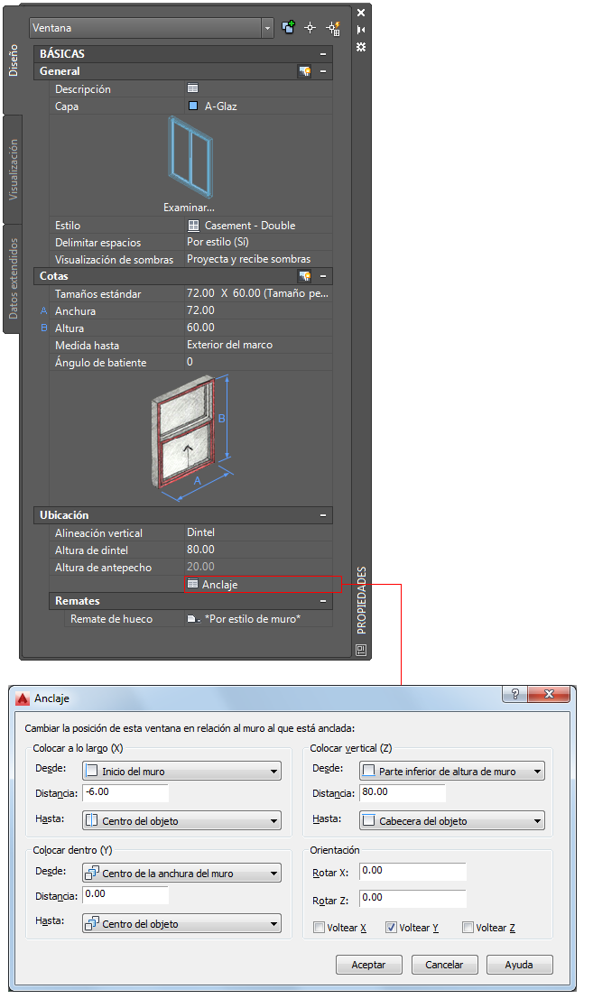 Las propiedades de los objetos se introducen y se modifican en la paleta Propiedades. La mayoría de las propiedades se indican directamente y se actualizan de inmediato en la pantalla. Algunos objetos cuentan con propiedades complejas que se indican en hojas de trabajo a las que se accede desde la paleta Propiedades.