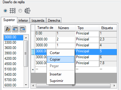 Atención: En una rejilla regular que presenta el mismo diseño de línea de rejilla en ambos lados (superior/inferior, izquierdo/derecho), no es necesario definir ningún parámetro en las fichas Derecha e Inferior. Si no se especifica lo contrario, los parámetros de los lados superior e izquierdo se aplican a los lados inferior y derecho.