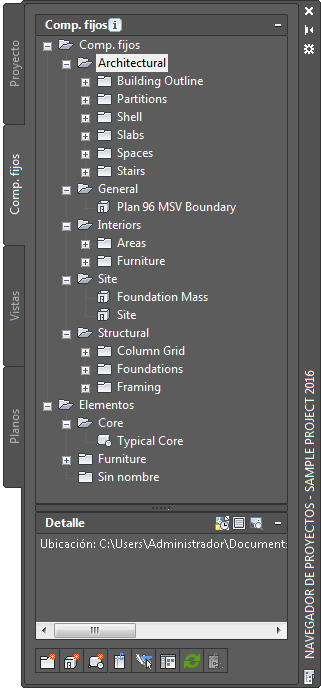 Para facilitar la organización del edificio, es posible clasificar en categorías los componentes del proyecto de edificio (componentes fijos, vistas y planos). Puede utilizar categorías tales como estructura exterior, estructura interior y divisiones interiores. La categorización de un componente fijo permite filtrarlo cuando se generan vistas.