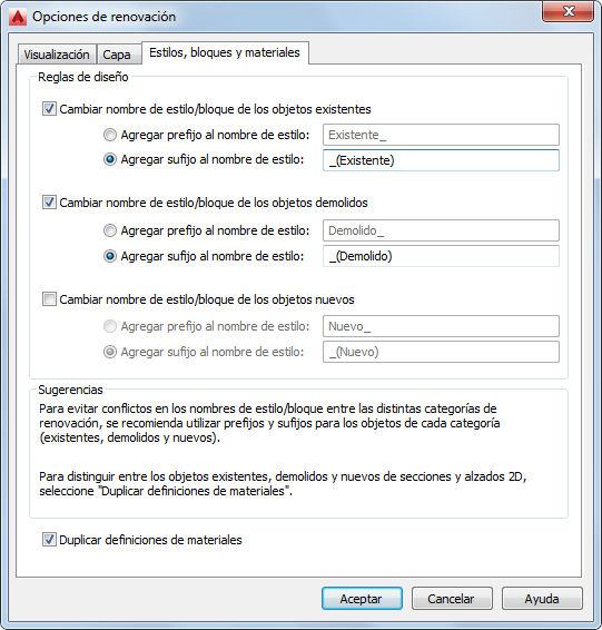Modifique las reglas de diseño de renovación para añadir automáticamente un prefijo o sufijo a los nombres de estilo y bloque basándose en su categoría de renovación. Si no define previamente un prefijo o un sufijo y ya existe el mismo nombre de bloque o estilo en otra categoría del dibujo, se mostrará un mensaje de alerta y podrá escribir un nuevo nombre manualmente.