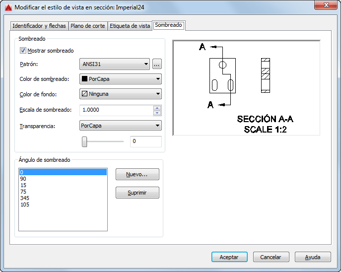 - Establece el patrón de sombreado que se utiliza para todos los sombreados dentro de las vistas en sección.