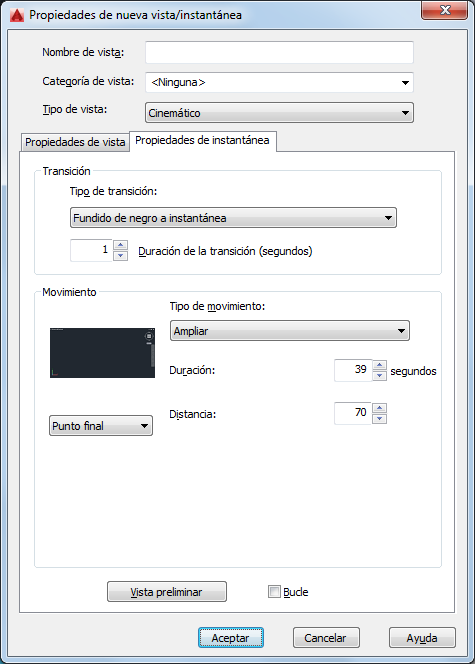 Establece la distancia necesaria para completar el movimiento cuando se asigna a la vista guardada el tipo de vista Cinemático.
