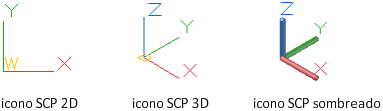 El icono de SCP permite visualizar la orientación actual del sistema de coordenadas personales con respecto a la dirección de visualización actual. El usuario tiene a su disposición varias versiones del icono, que podrá cambiar de color, de tamaño y de posición.
