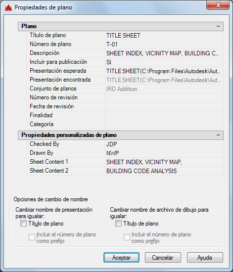 Muestra las propiedades del plano seleccionado. También muestra las propiedades personalizadas, si las hay. Puede escribir un nuevo valor para modificar cualquiera de las propiedades del plano. Presentación esperada es la ruta y el nombre de archivo del dibujo donde se guardó el plano. Presentación encontrada es la ruta y el nombre de archivo del dibujo donde se encontró el plano. Si las rutas son diferentes, puede modificar la ruta y el nombre de archivo en Presentación esperada. Esta operación vuelve a asociar el plano con el conjunto de planos.