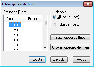 Presenta una lista con los grosores de línea de la tabla de estilos de trazado. Es posible modificar grosores de línea existentes, pero no añadirlos ni suprimirlos. Si cambia un valor de grosor de línea, también cambian otros estilos de trazado que utilicen grosor de línea.