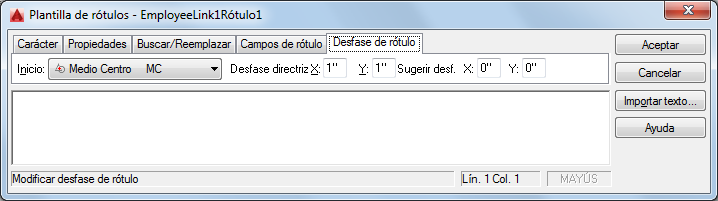 Precisa un desfase X e Y para el objeto de texto de líneas múltiples respecto al objeto directriz asociado. Por defecto, las opciones Desfase directriz X e Y están definidas como 1, lo cual indica que el desfase del texto de rótulo es de 1 unidad en los planos X e Y desde el extremo del objeto directriz. Los parámetros Desfase directriz sólo se aplican a los rótulos enlazados.