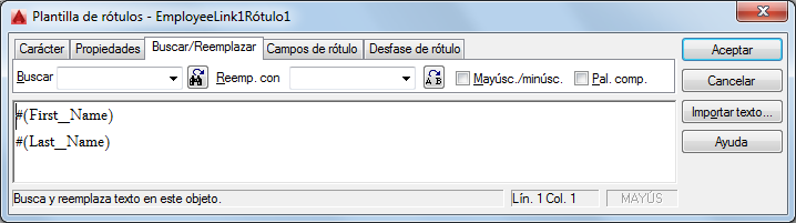 Busca cadenas de texto especificadas en la plantilla de rótulo y las reemplaza con texto nuevo.