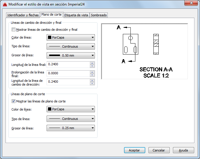 Controla las propiedades de los segmentos de línea de plano de las líneas de sección.