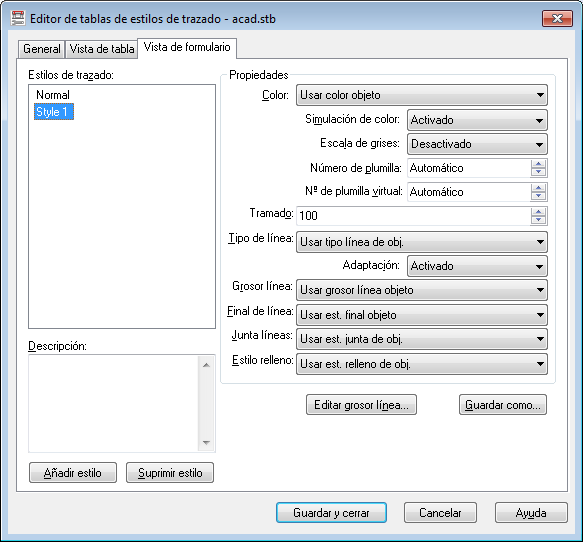 El estilo de trazado se basa en Normal, que utiliza las propiedades de un objeto y no aplica por defecto ninguna sustitución. Debe especificar las sustituciones que quiera aplicar después de crear el nuevo estilo de trazado. No puede añadir un nuevo estilo a la tabla de estilos de trazado dependiente de color, que tiene 255 estilos de trazado asignados. Tampoco puede añadir un estilo a una tabla de estilos de trazado guardada que tenga una tabla de conversión.
