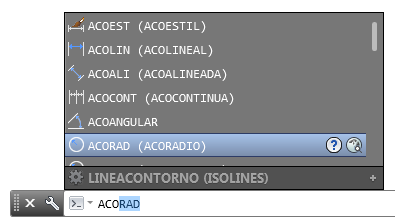 Si comienza a escribir el nombre del comando o de la variable de sistema en la línea de comando, la función Autocompletar mostrará las opciones. Por ejemplo, si escribe acota, todos los comandos y las variables de sistema que empiecen con dichos caracteres se enumerarán en la lista, tal y como se muestra.