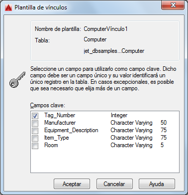 Muestra todos los campos disponibles para la tabla de base de datos actual, así como el tipo de campo y, si se trata de campos de caracteres, la longitud. Puede especificar los campos clave de la plantilla de vínculos activando la casilla de verificación situada a la izquierda del nombre del campo.