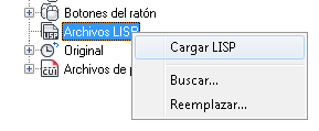 En la ficha Personalizar, en el panel Personalizaciones en <nombre de archivo>, haga clic con el botón derecho en el nodo Archivos LISP. Haga clic en Cargar LISP.